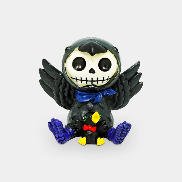 Leopold is s a hand painted resin figurine featuring the signature skeleton Furrybones dressed up as a Black Raven and her Chick.
