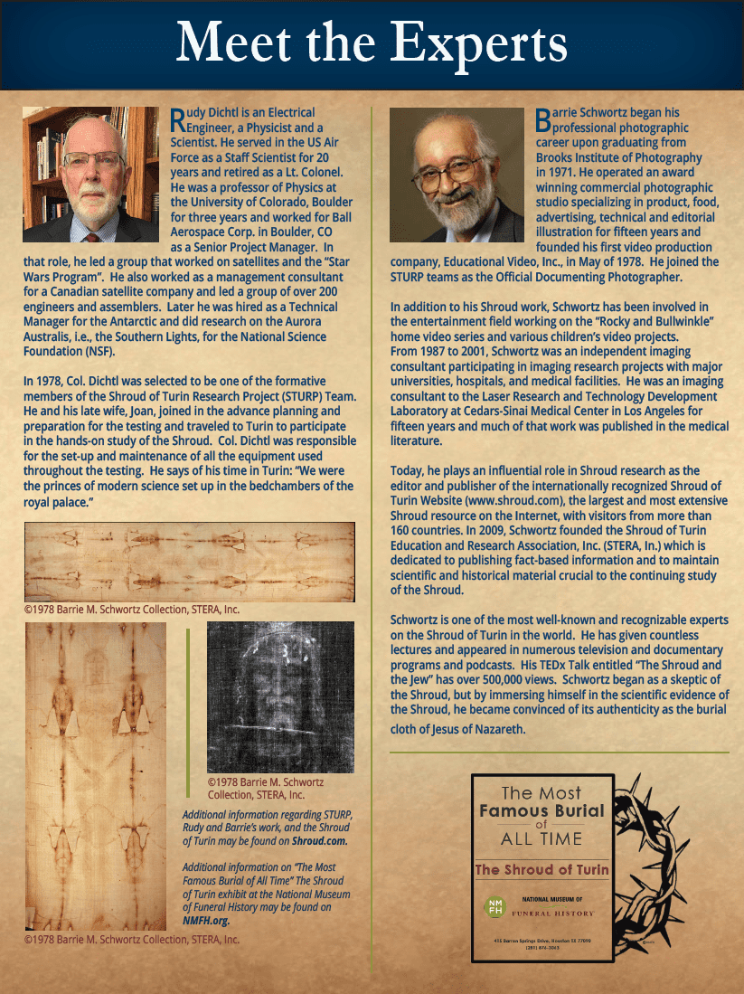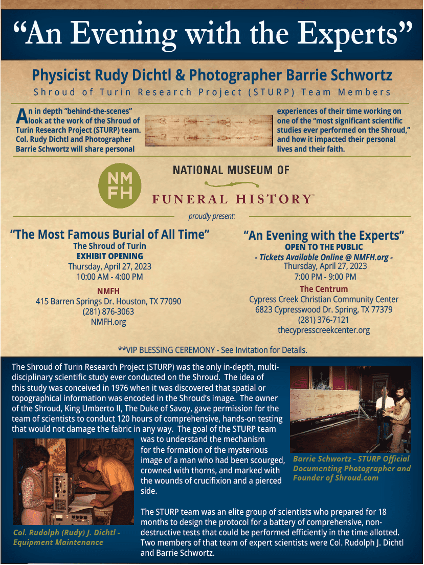 An in depth “behind-the-scenes” look at the work of the Shroud of Turin Research Project (STURP) team. Col. Rudy Dichtl and Photographer Barrie Schwortz will share personal experiences of their time working on one of the “most significant scientific studies ever performed on the Shroud,” and how it impacted their personal lives and their faith.