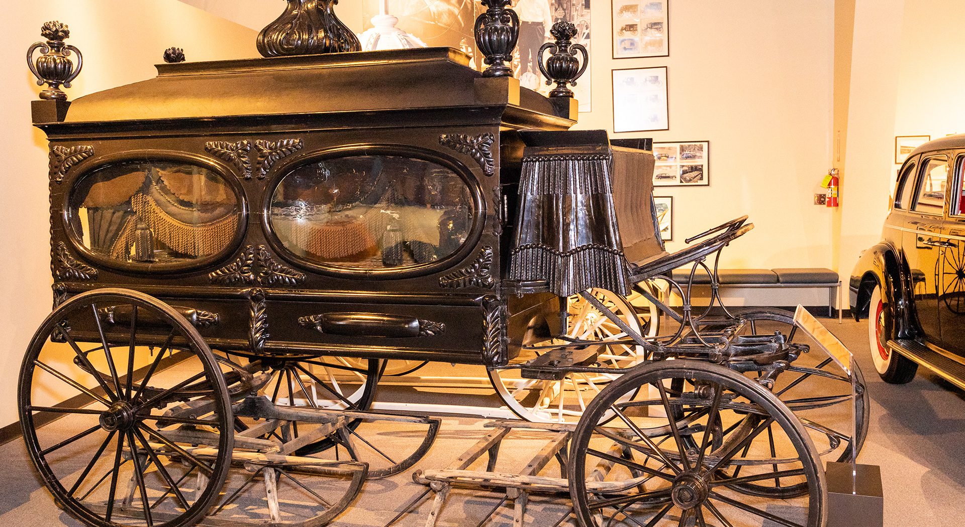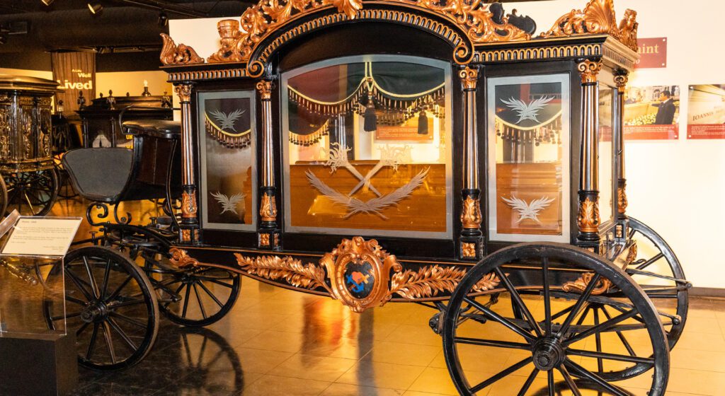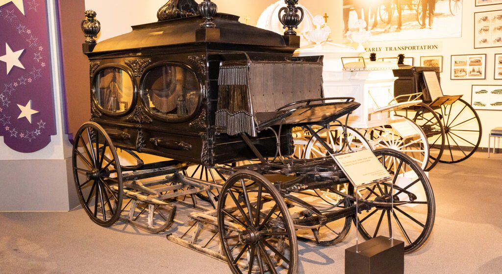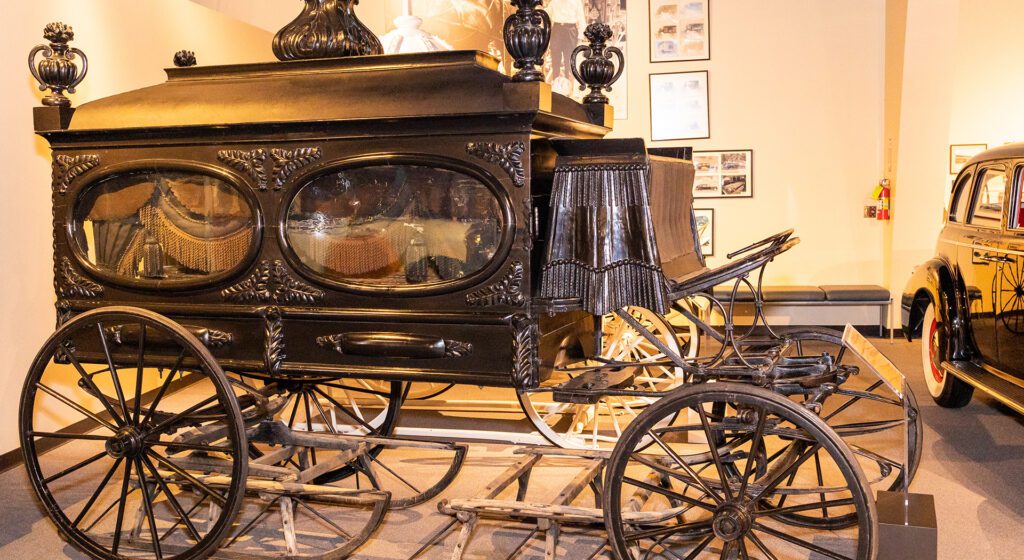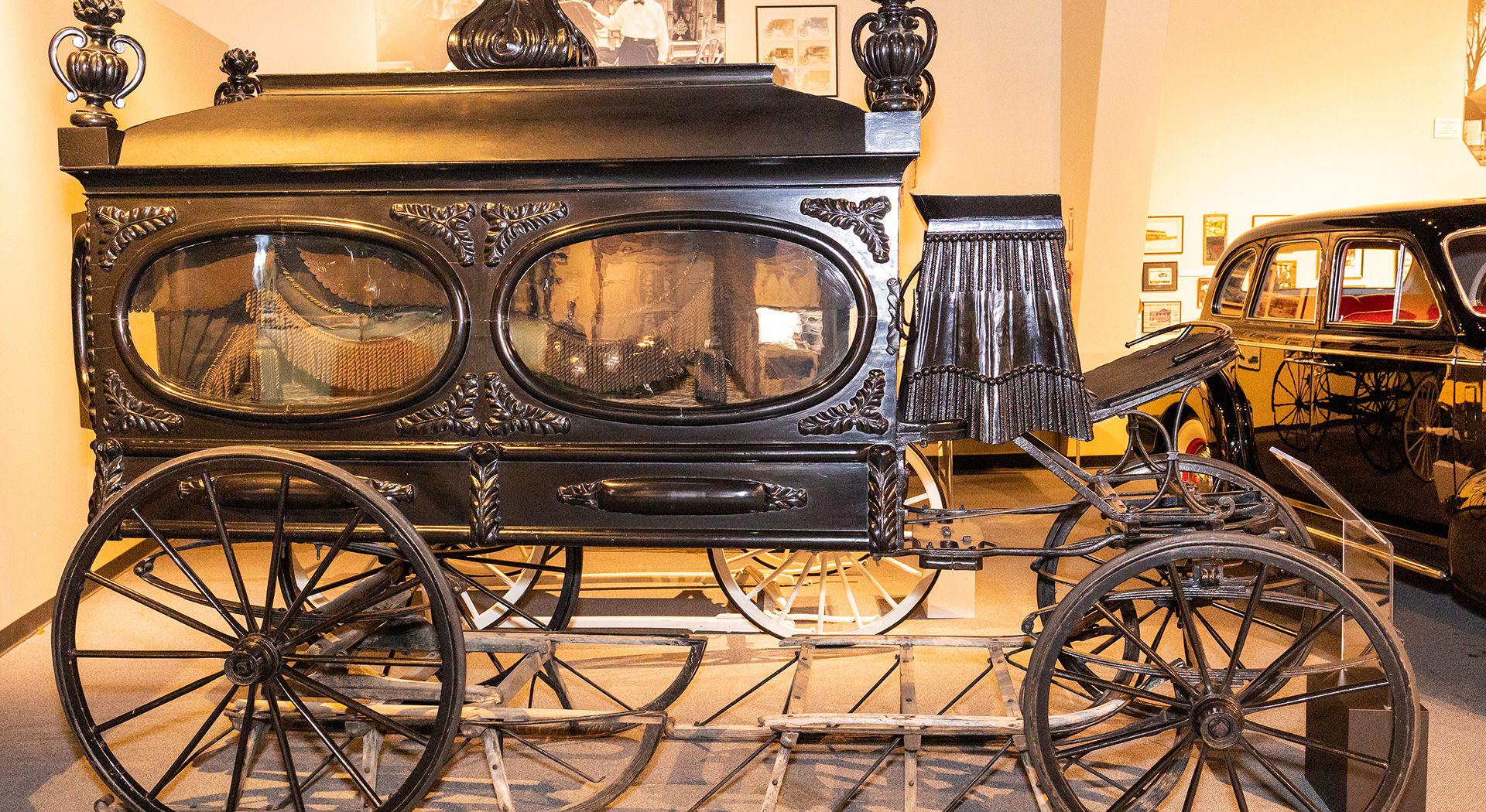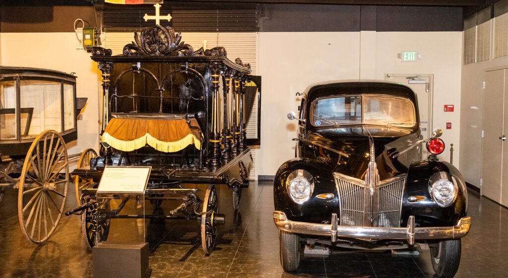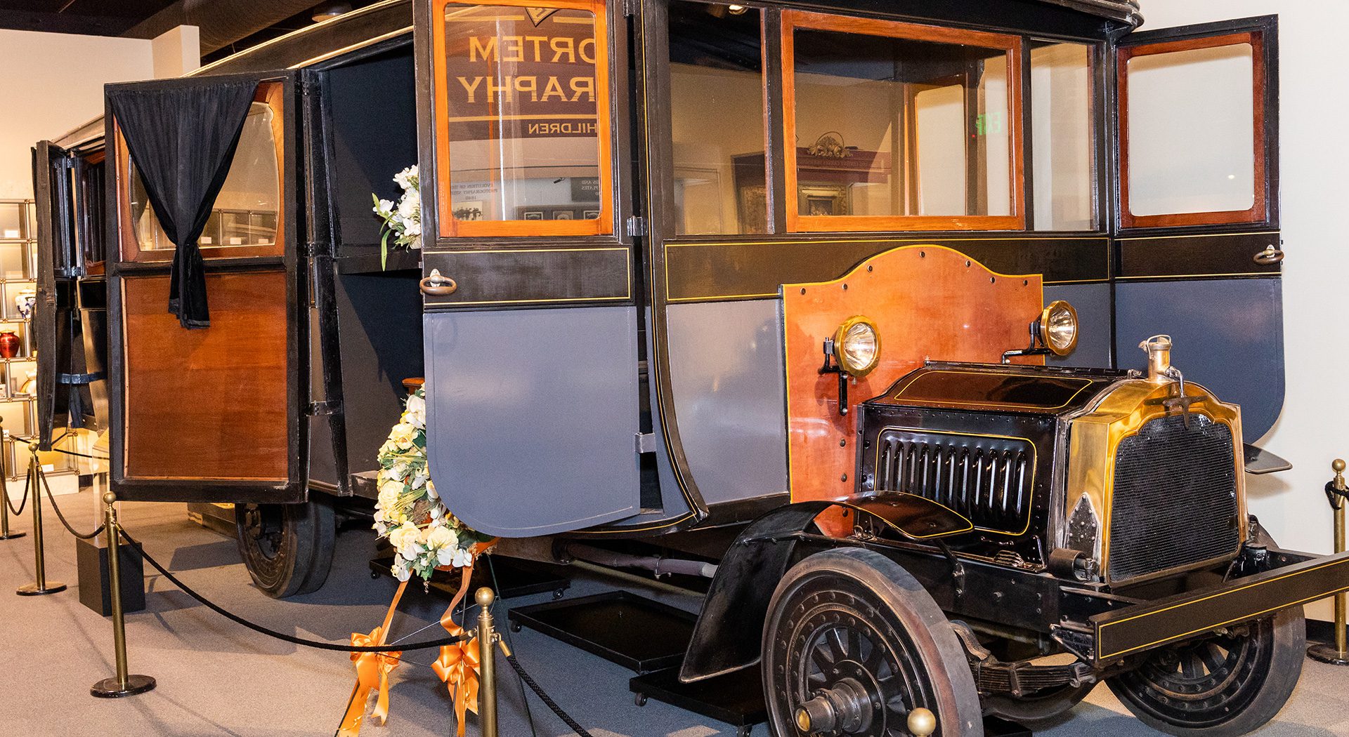 The Museum’s collection of rare funeral service vehicles traces the evolution of funerary customs, from the elegant horse-drawn funeral carriages of the 19th century to the actual hearses used in