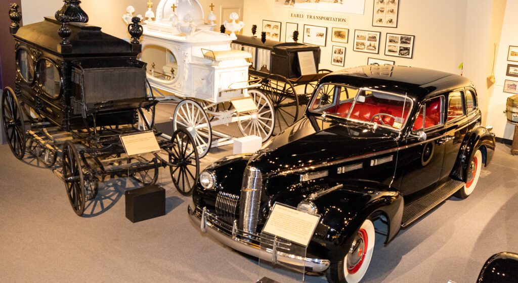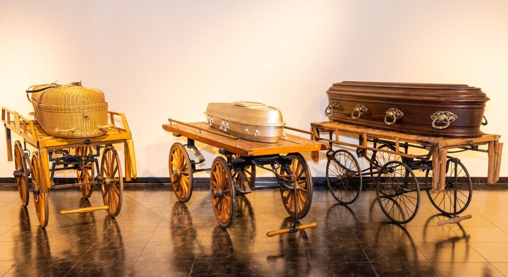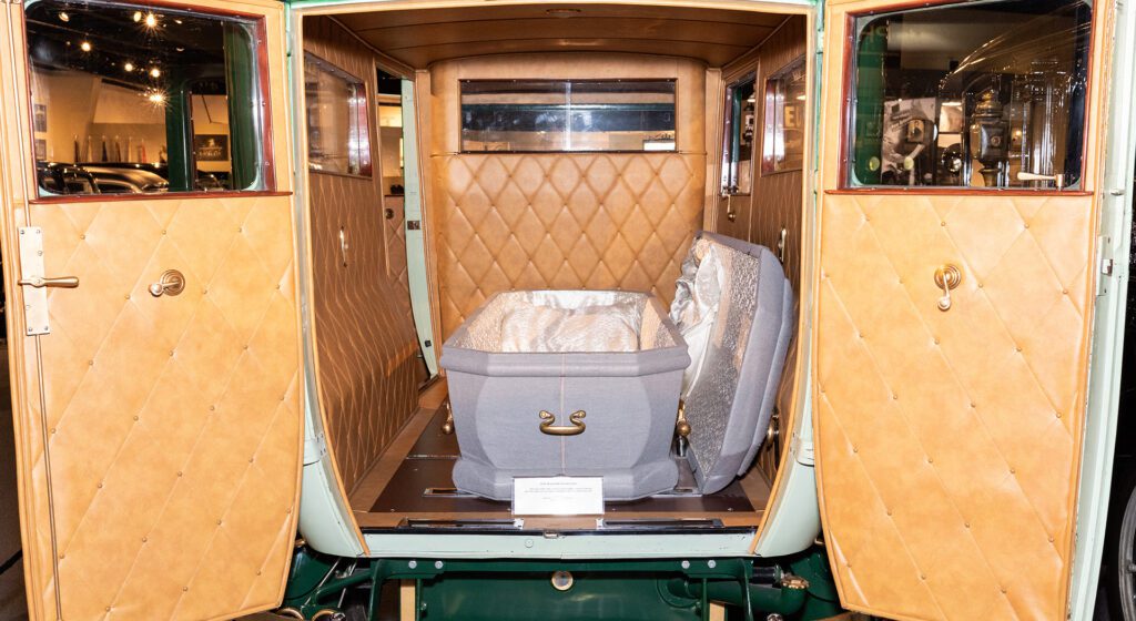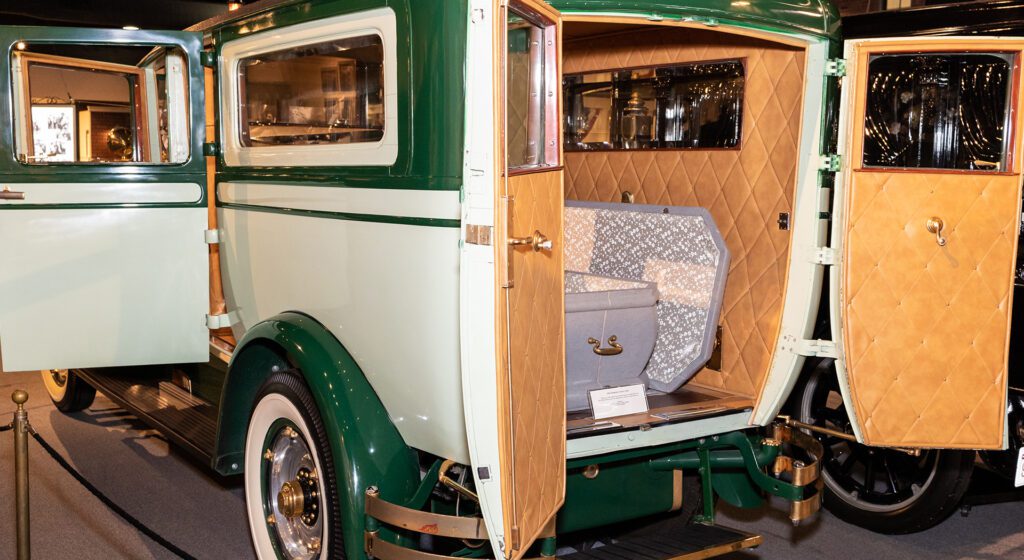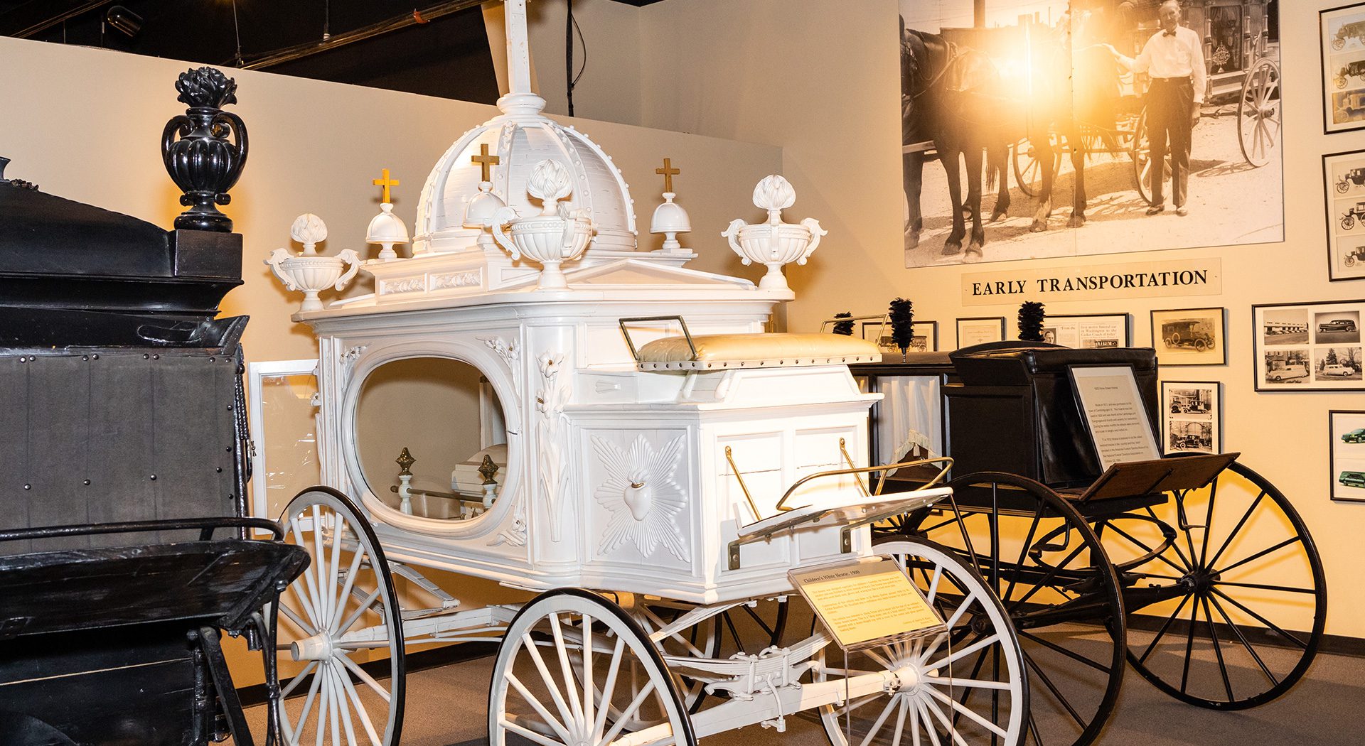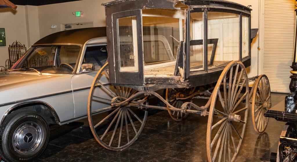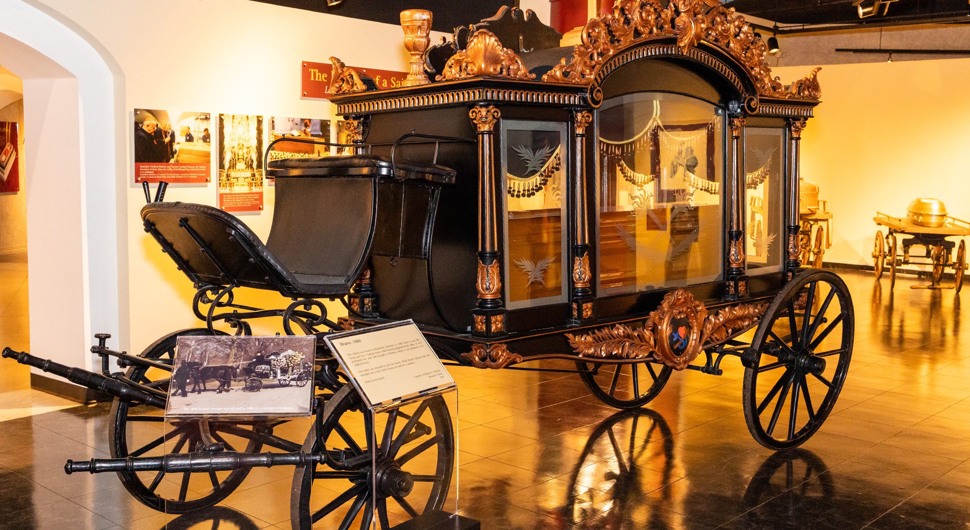 The Museum’s collection of rare funeral service vehicles traces the evolution of funerary customs, from the elegant horse-drawn funeral carriages of the 19th century to the actual hearses used in