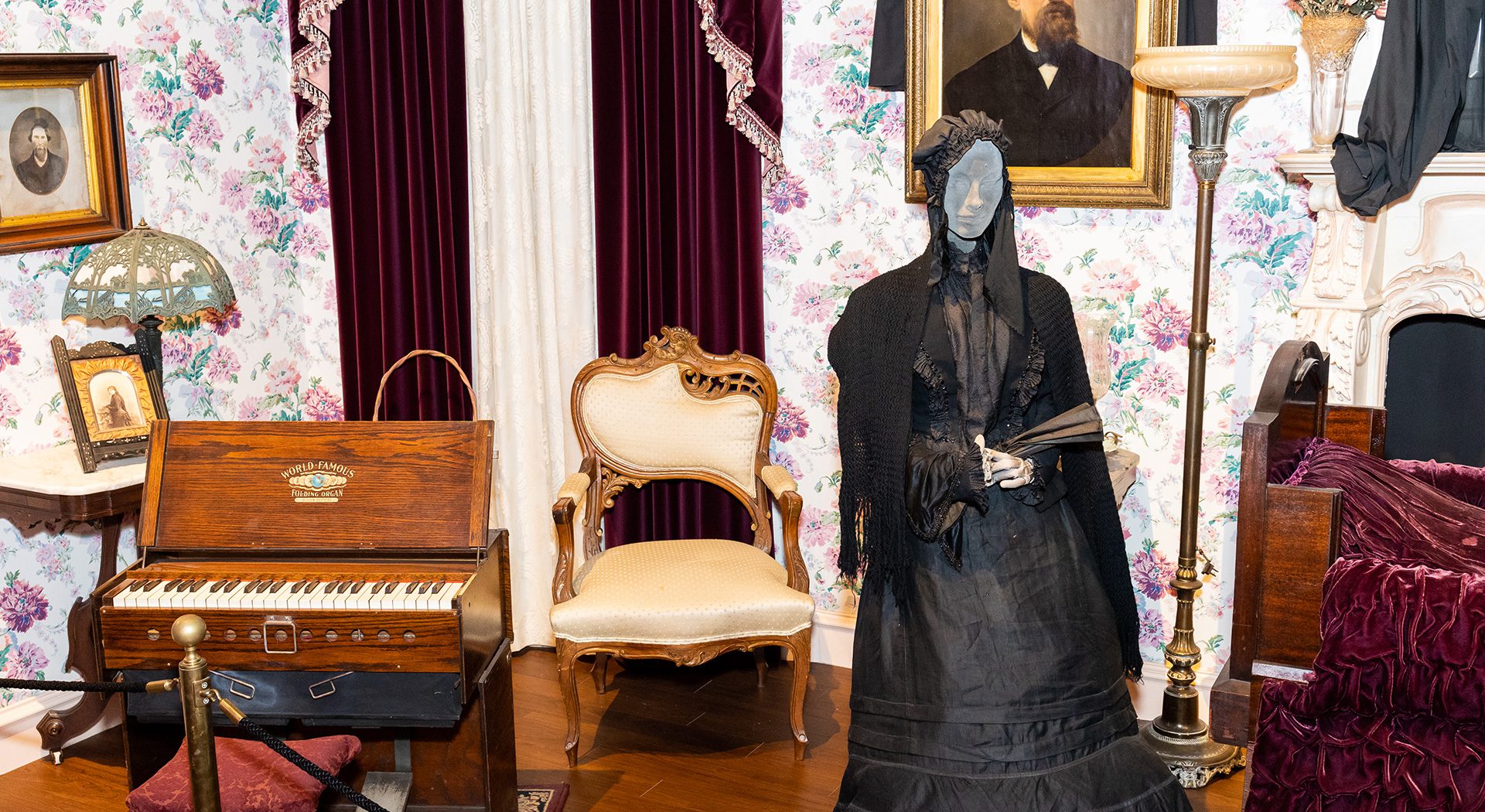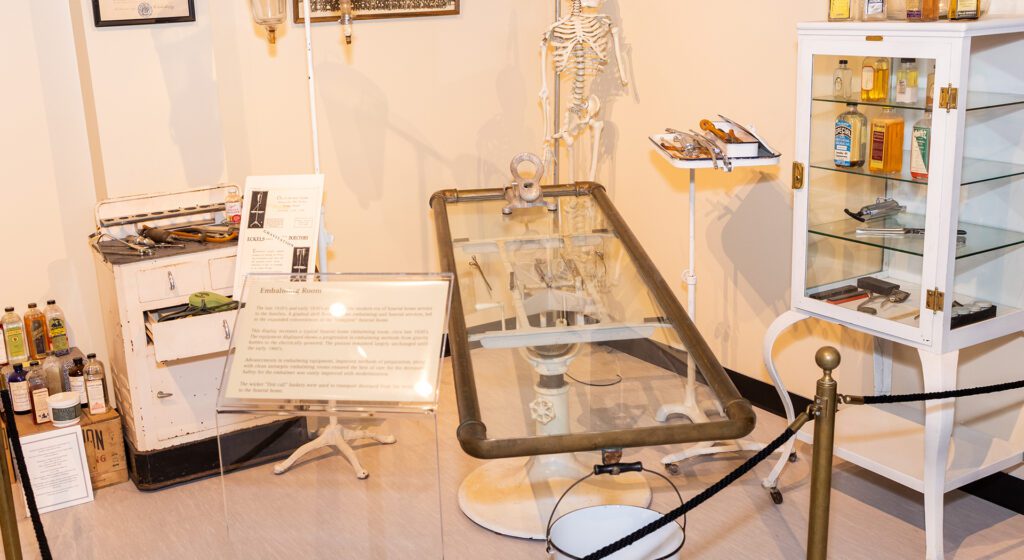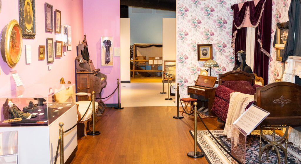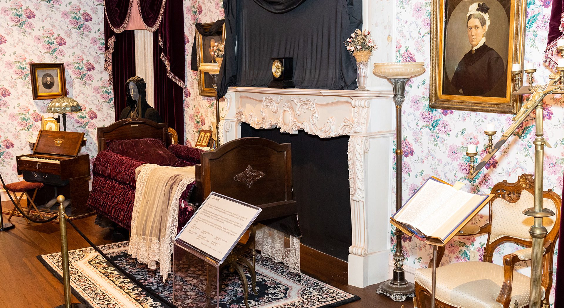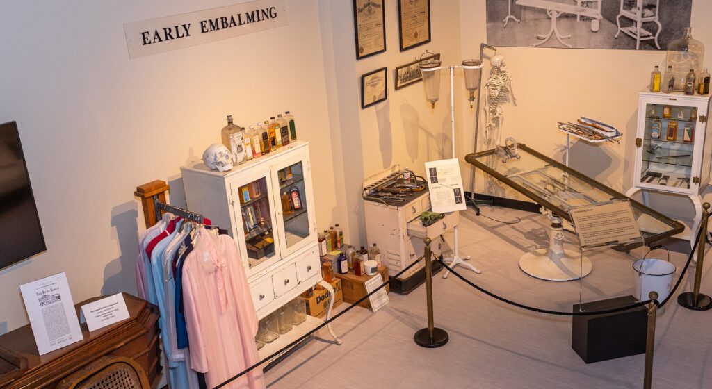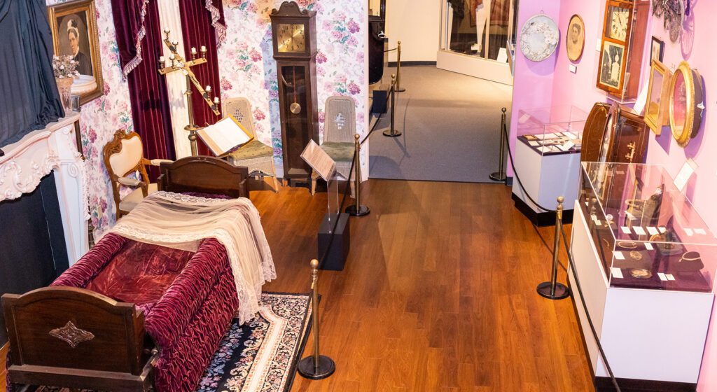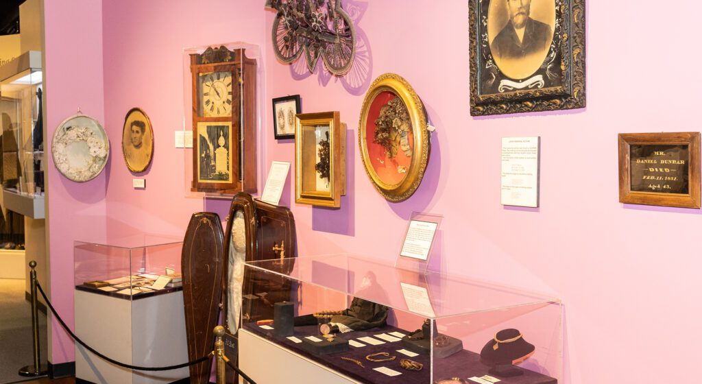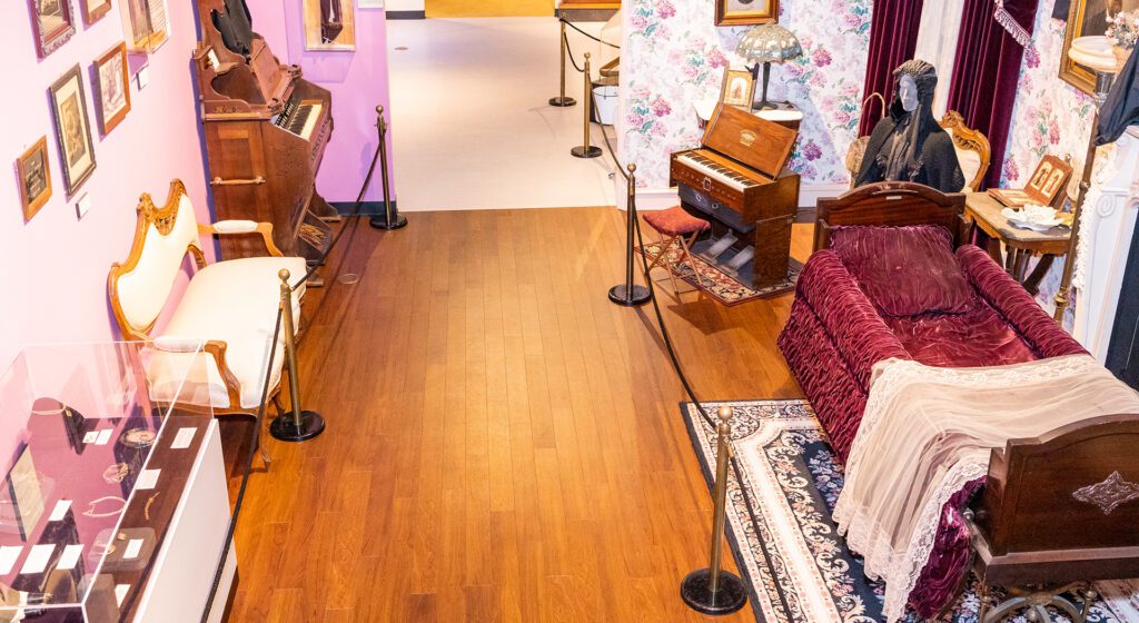 Walk through the exhibit’s full-scale model of a typical Victorian living room, or parlor, depicting the traditional wake and funeral practices, which took place inside the home. During the 1800s, determining that a person was actually dead was not as simple as it is today, as they didn’t have