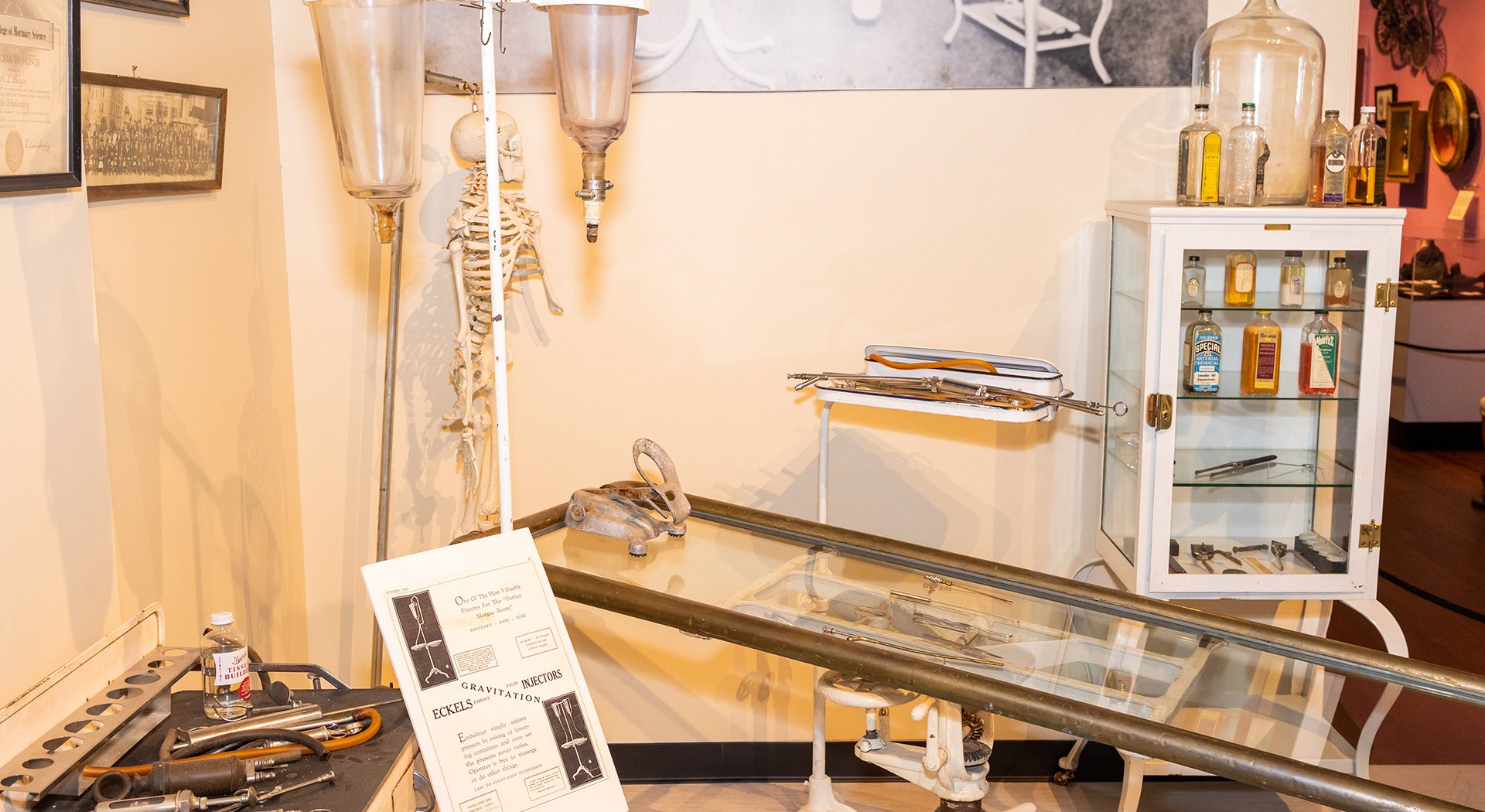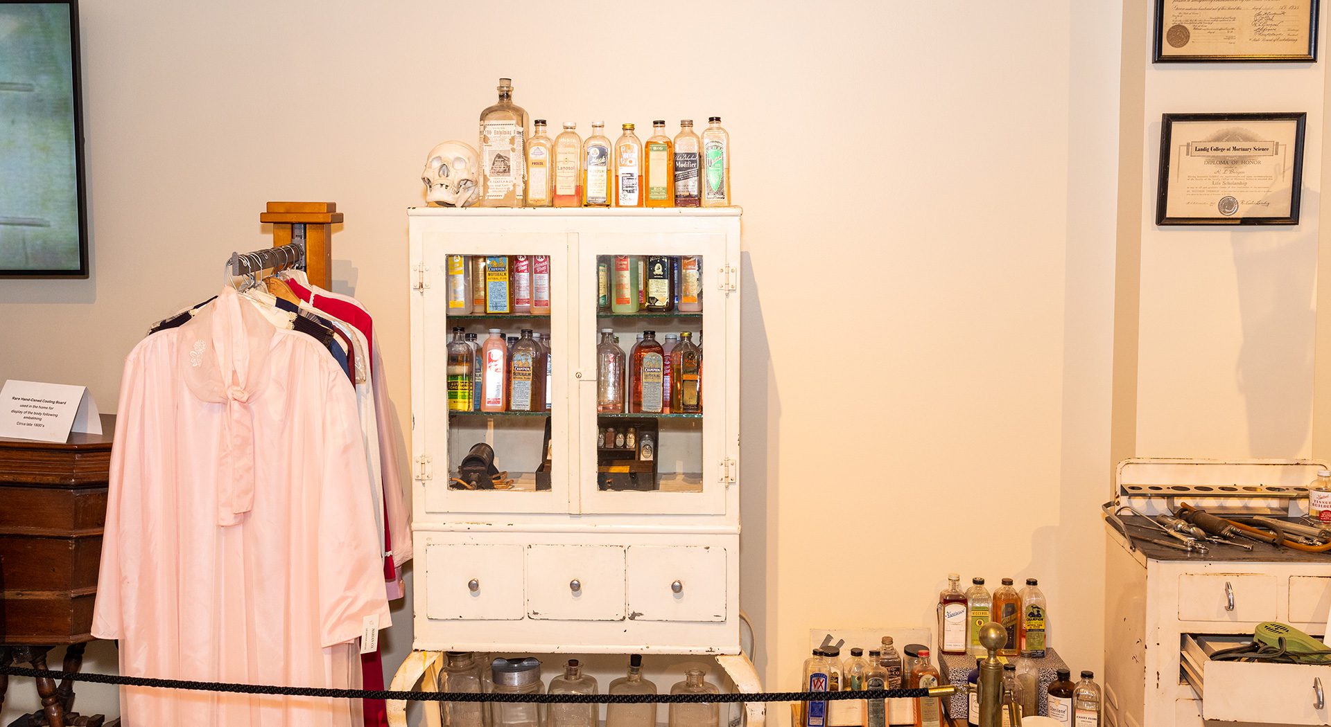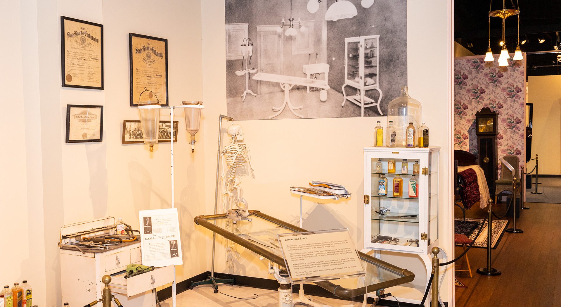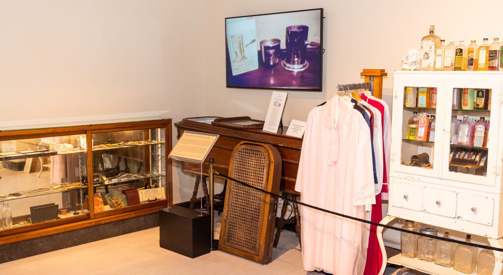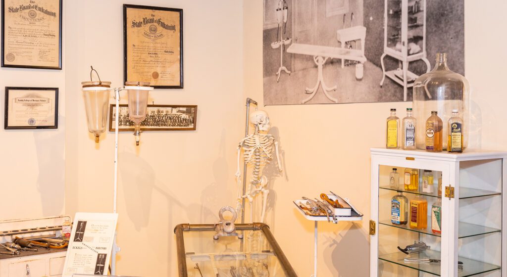 Walk through the exhibit’s full-scale model of a typical Victorian living room, or parlor, depicting the traditional wake and funeral practices, which took place inside the home. During the 1800s, determining that a person was actually dead was not as simple as it is today, as they didn’t have