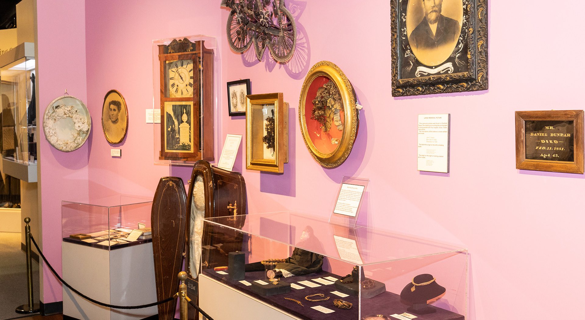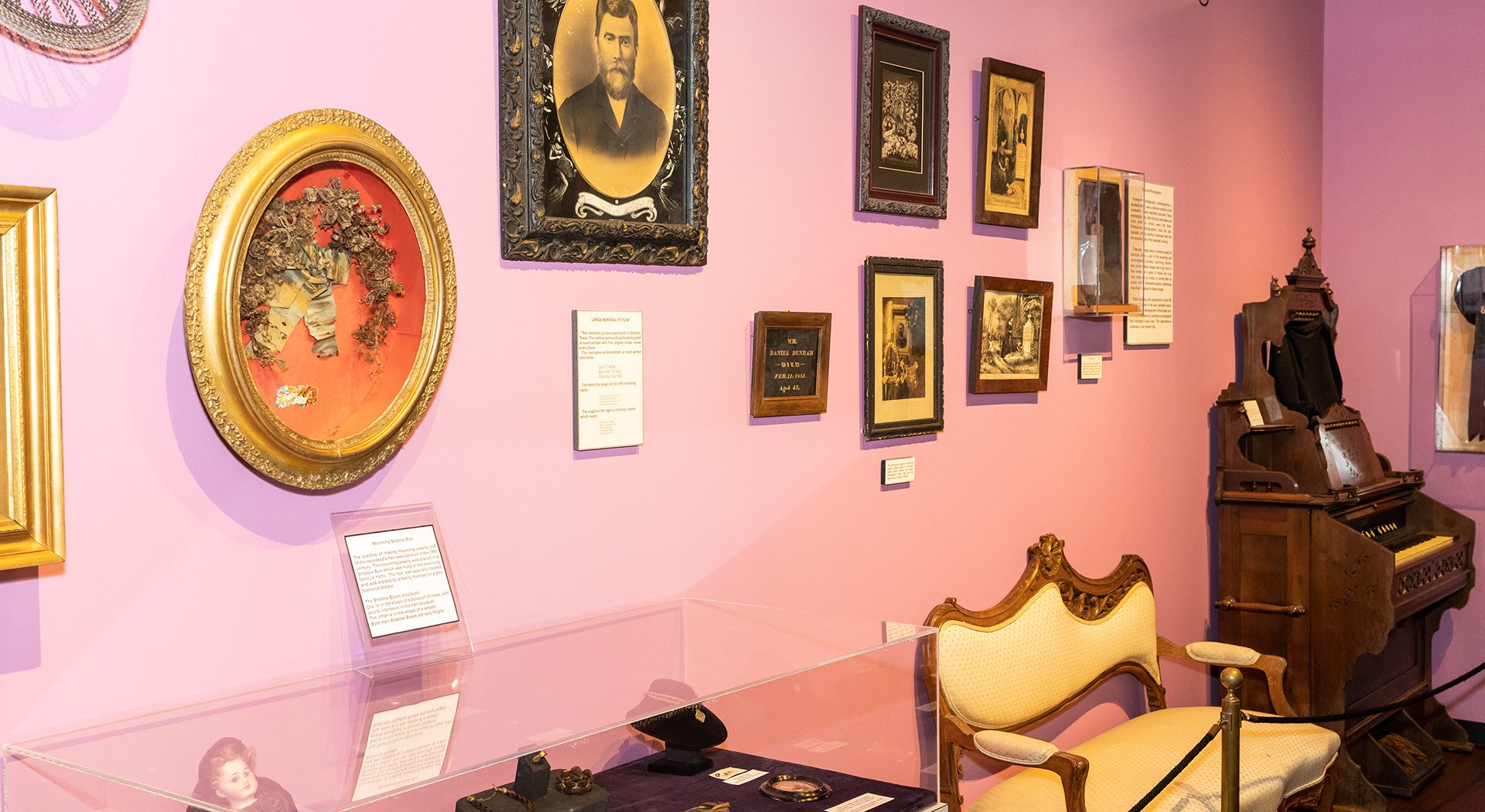 rief was more than just an emotion for Americans during the 1800s—it was a way of life. Victorian social etiquette put great social pressure on mourning, resulting in the practice of public mourning rather than private grieving. In this exhibit, visitors can see authentic mourning clothing for women and children, including jewelry fashioned from the hair of the deceased and testaments to the strict rules for widows of that era. Mourning customs also influenced home décor during Victorian times, as shown in a collection of clocks, portraits and quilts.