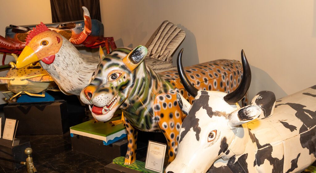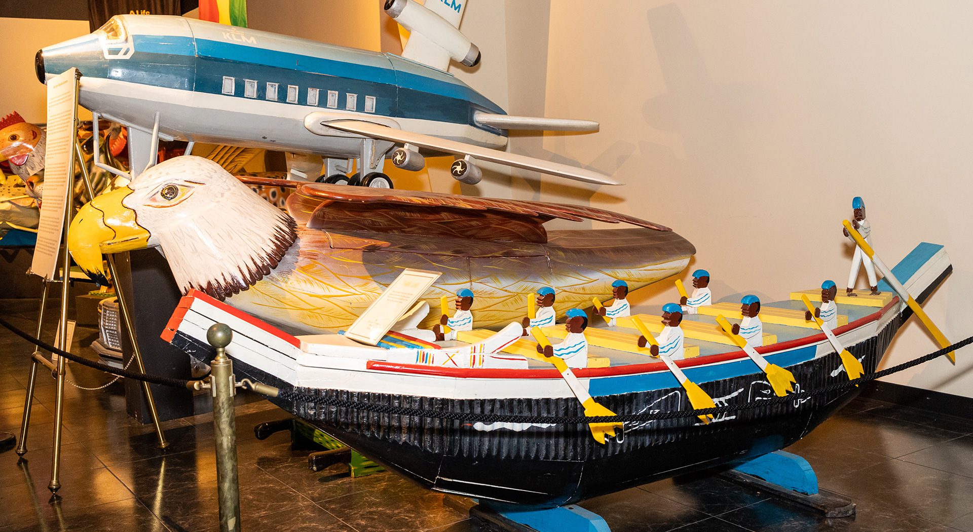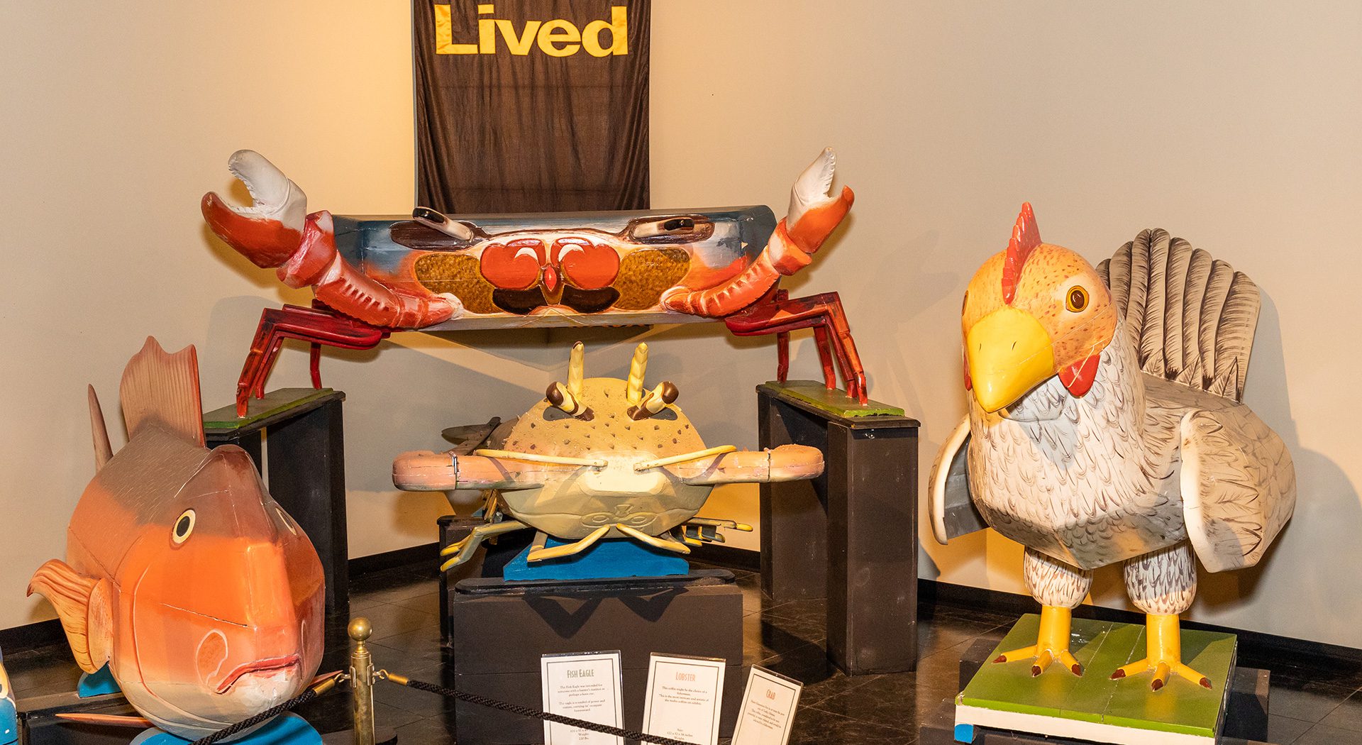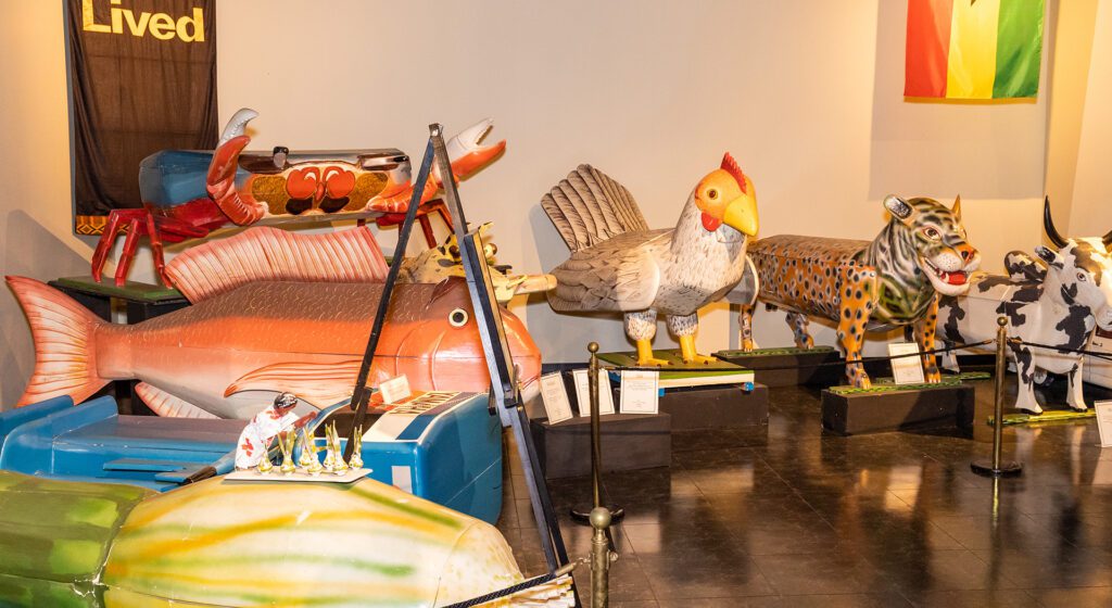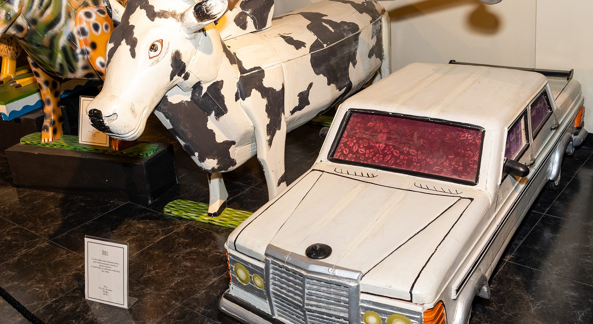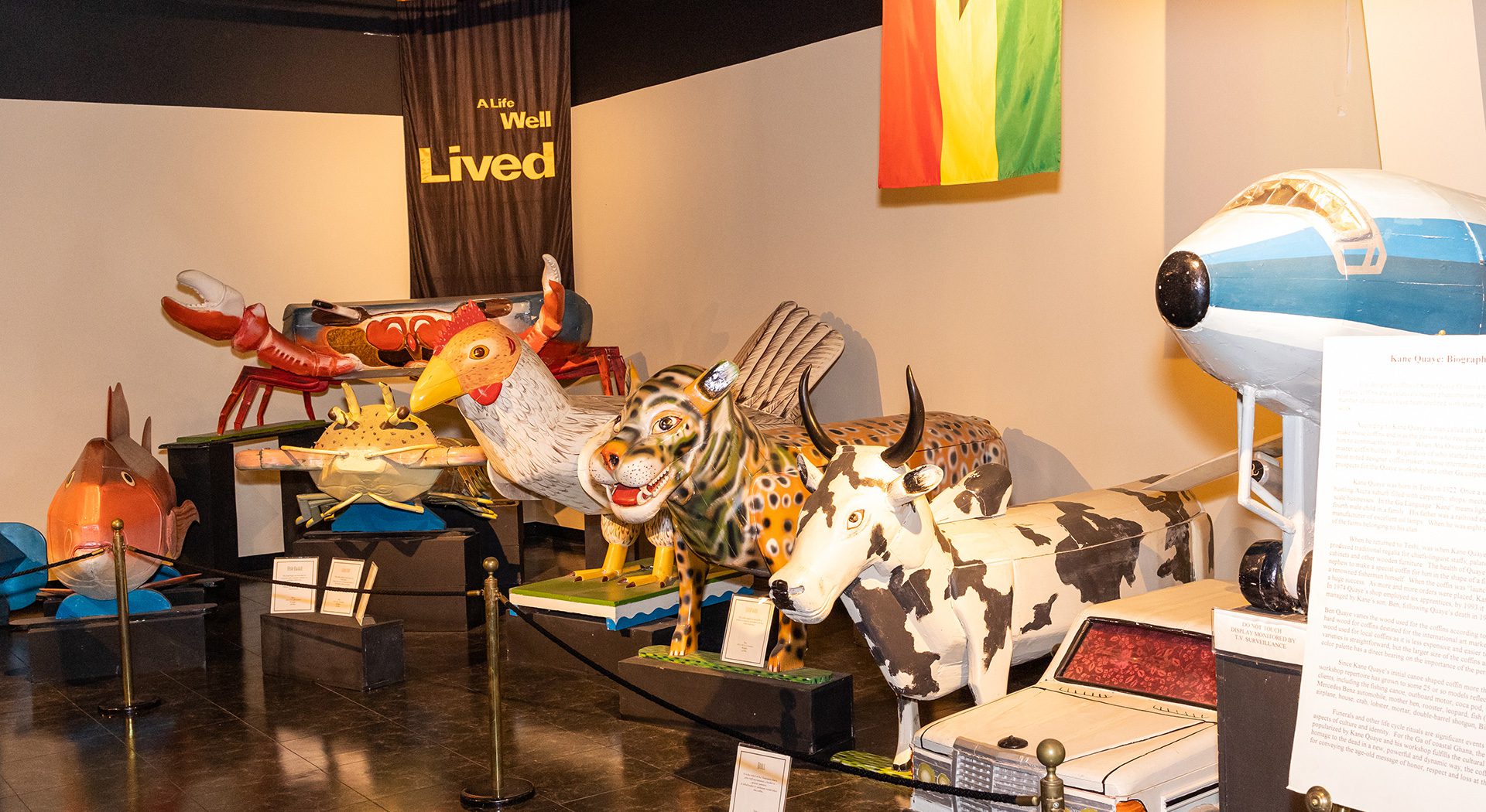 o the people of Ghana, West Africa, death is not an end, but a transition to the spiritual realm of their ancestors. In fact, ancestors are forever considered members of the family. It is believed that if the deceased is properly honored, such actions secure spiritual favor for the family left on earth. This unique exhibit displays 12 artfully sculpted coffins, each uniquely created to capture the essence of the departed—whether a character trait, an occupation, a symbol of one’s standing in the community or what they hope to achieve in the afterlife.