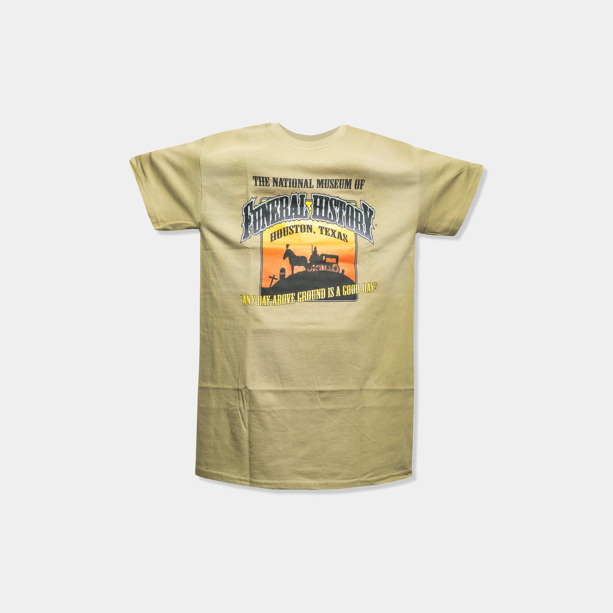 Features funeral carriage insignia with sunset and “Any day above ground is a good one” slogan